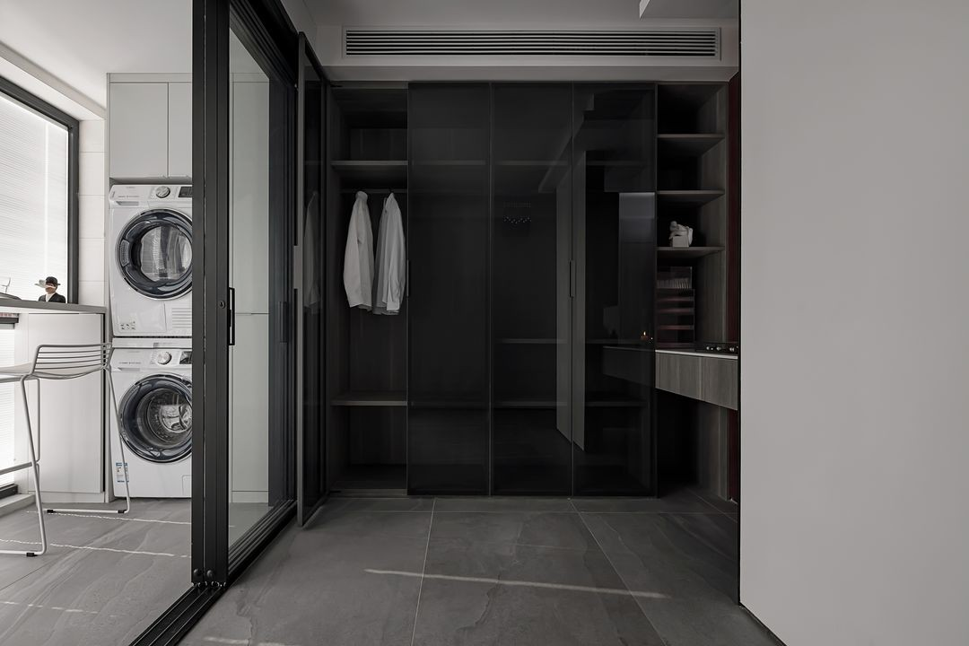 衣帽間氣質(zhì)低調(diào),深色玻璃柜門盡顯神秘感,整體空間呈現(xiàn)精致簡(jiǎn)約的視覺效果。從衣帽間通往主臥室的隱形門,采用了與墻體無縫對(duì)接的隱框門設(shè)計(jì),刷上與墻面一體的藝術(shù)涂料,視覺上整體性更強(qiáng),極簡(jiǎn)的造型讓空間更加干凈利落。