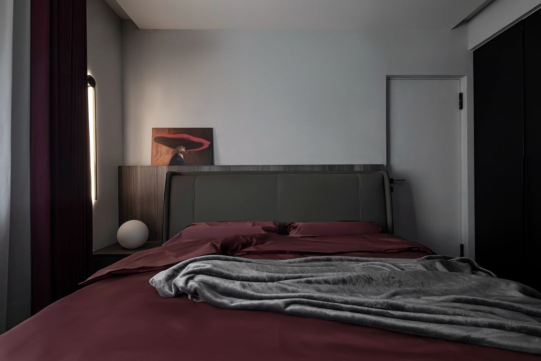 空間布局張弛有度,主臥室空間一如既往的深沉,整體黑白灰的空間里,同樣的那一抹紅,給人強(qiáng)烈的視覺沖擊增加了空間的暖意。